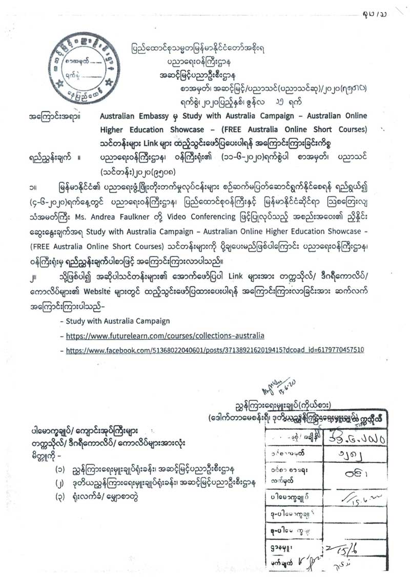Study with Australlia Campaign - Australian Online Higher Education Showcase - (FREE Australia Online Short Courses) သင်တန်းများကို အောက်ဖော်ပြပါ လင့်ခ် များမှတစ်ဆင့် ပို့ချပေးမည် ြဖစ်ကြောင်း ပညာရေးဝန်ကြီးဌာန ဝန်ကြီးရုံးမှ ရည်ညွှန်းချက်စာဖြင့် အကြောင်းကြားလာပါသည်။
