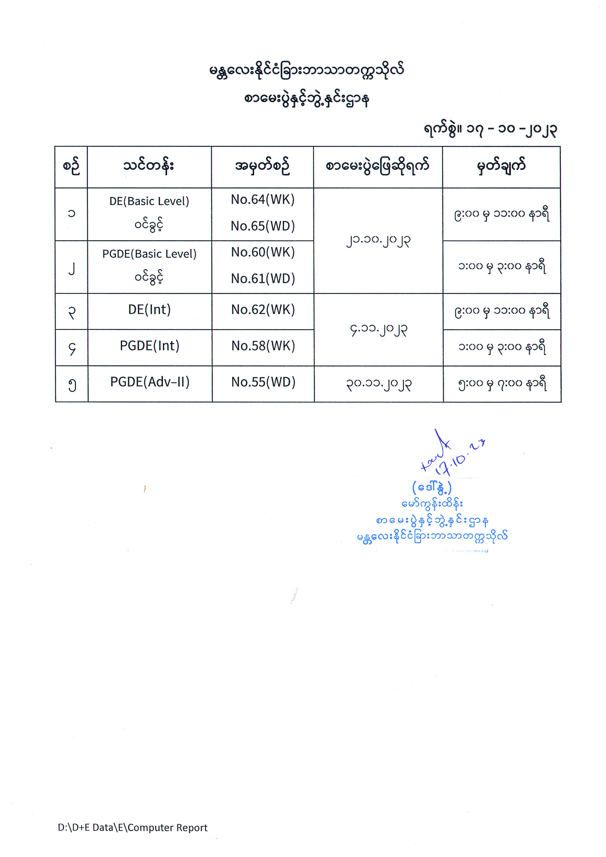 DE, PGDE (Basic Level)ဝင်ခွင့်၊ DE(Int), PGDE(Int), PGDE(Adv-II) စာမေးပွဲ ဖြေဆိုရက်များ စာရင်း Published: 18 October 2023 Category: Announcements