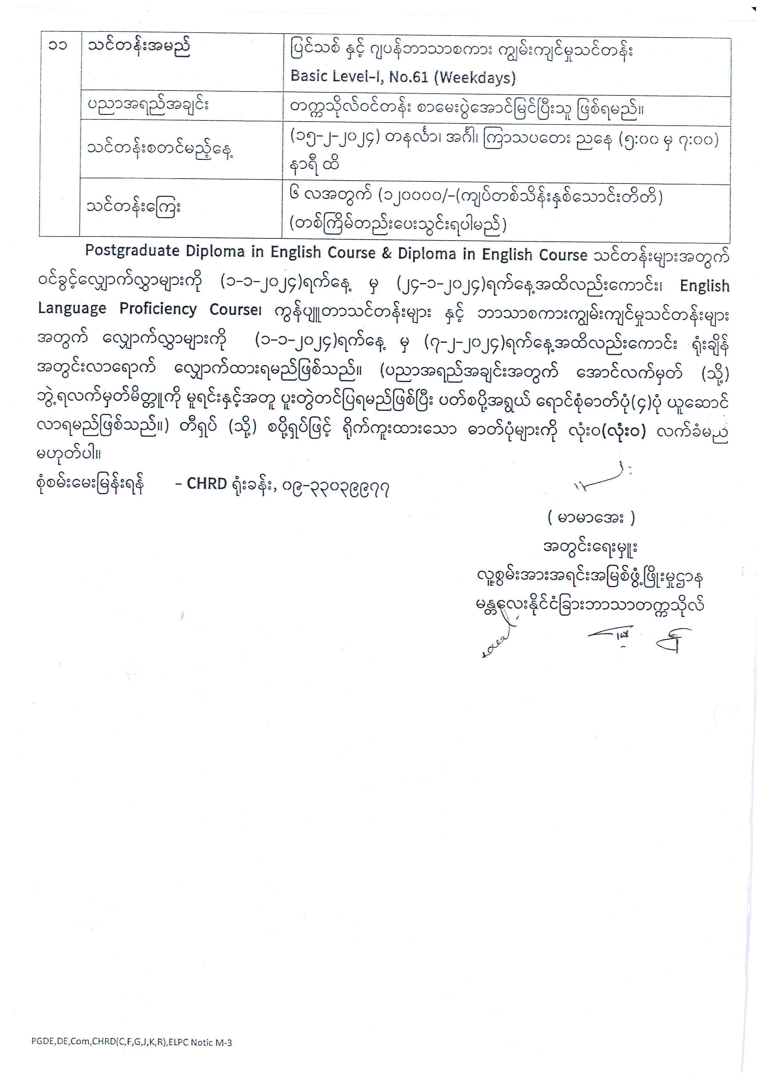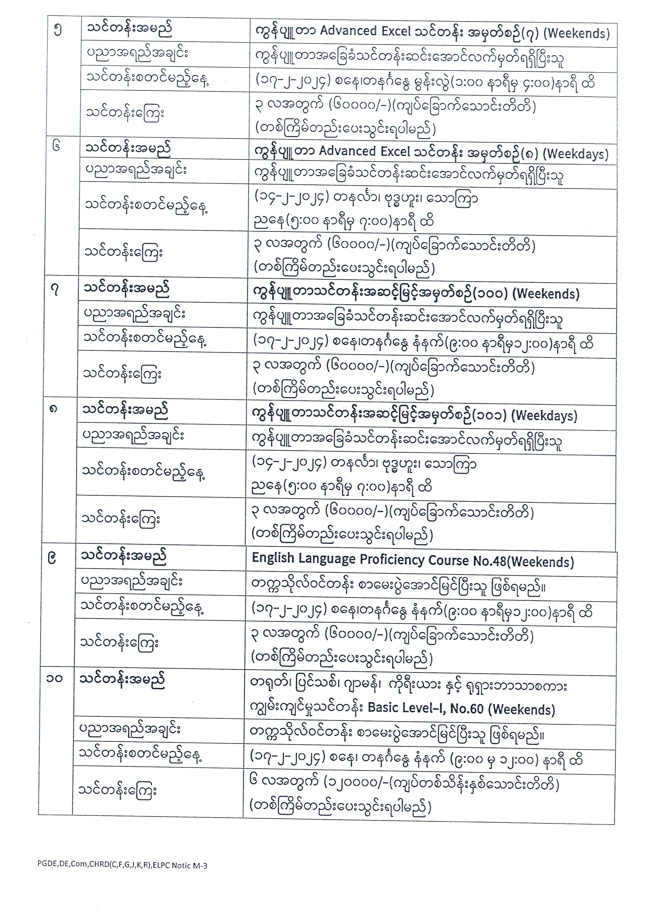 (လူ့စွမ်းအားအရင်းအမြစ်ဖွံ့ဖြိုးမှုဌာန)သင်တန်းလျှောက်လွှာများခေါ်ယူခြင်း Published: 26 December 2023 Category: Announcements