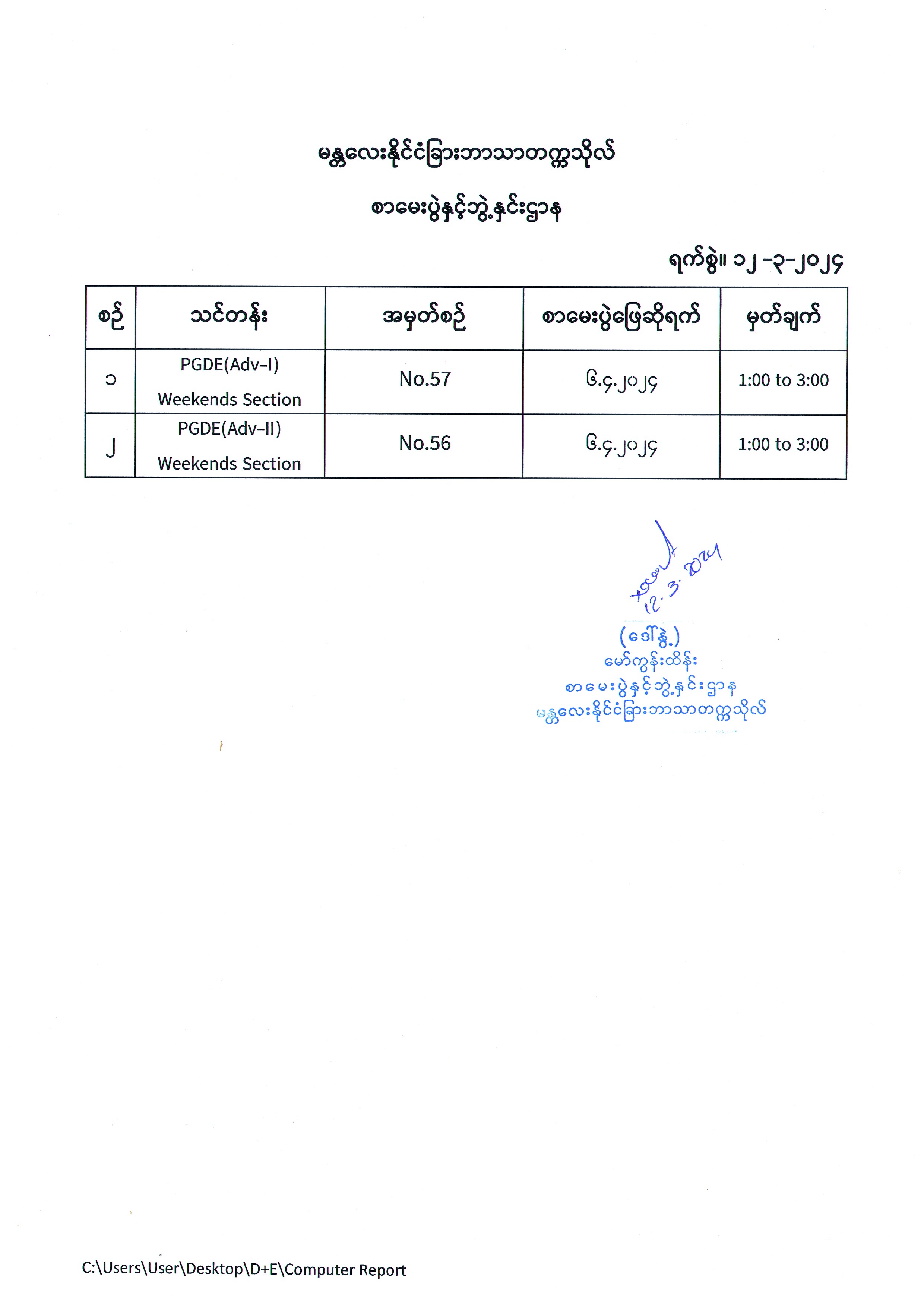 PGDE(Adv-I) Weekends Section No.57 & PGDE(Adv-II) Weekends Section No.56 တို့၏ စာမေးပွဲဖြေဆိုရက်များစာရင်း Published: 12 March 2024 Category: Announcements