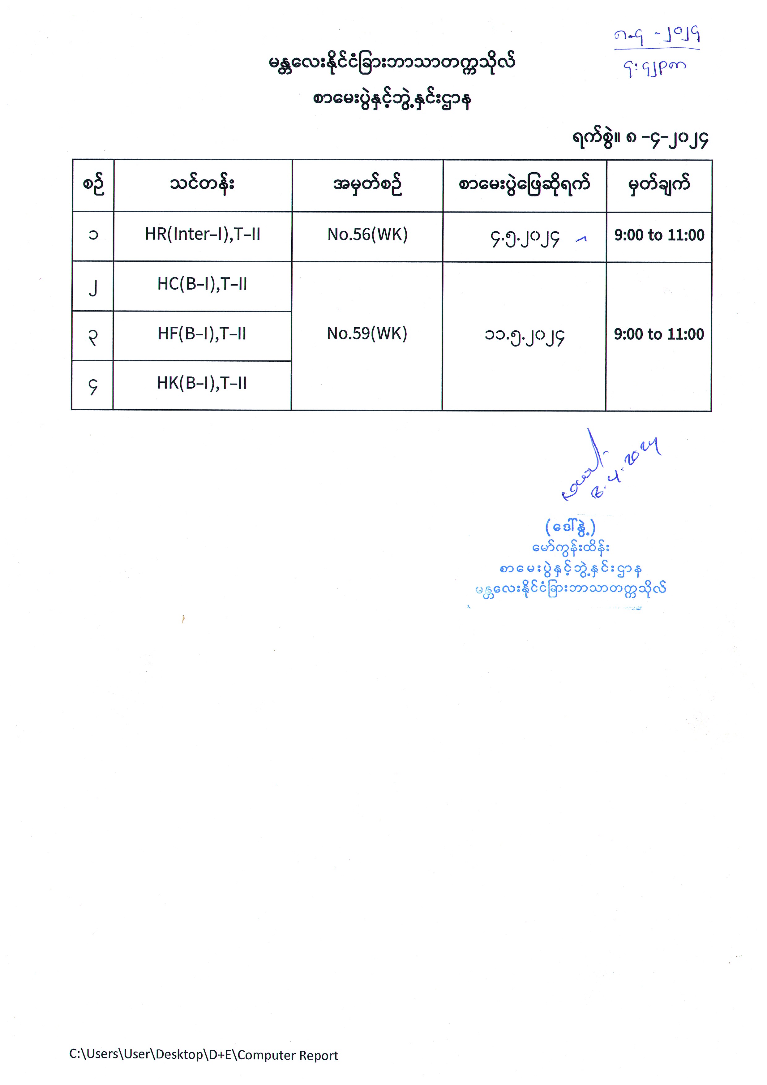 HR(Inter-I), T-II No.56(WK)နှင့် HC(B-I), HF(B-I), HK(B-I), T-II No.59(WK) တို့၏ စာမေးပွဲဖြေဆိုရက်များစာရင်း Published: 10 April 2024 Category: Announcements