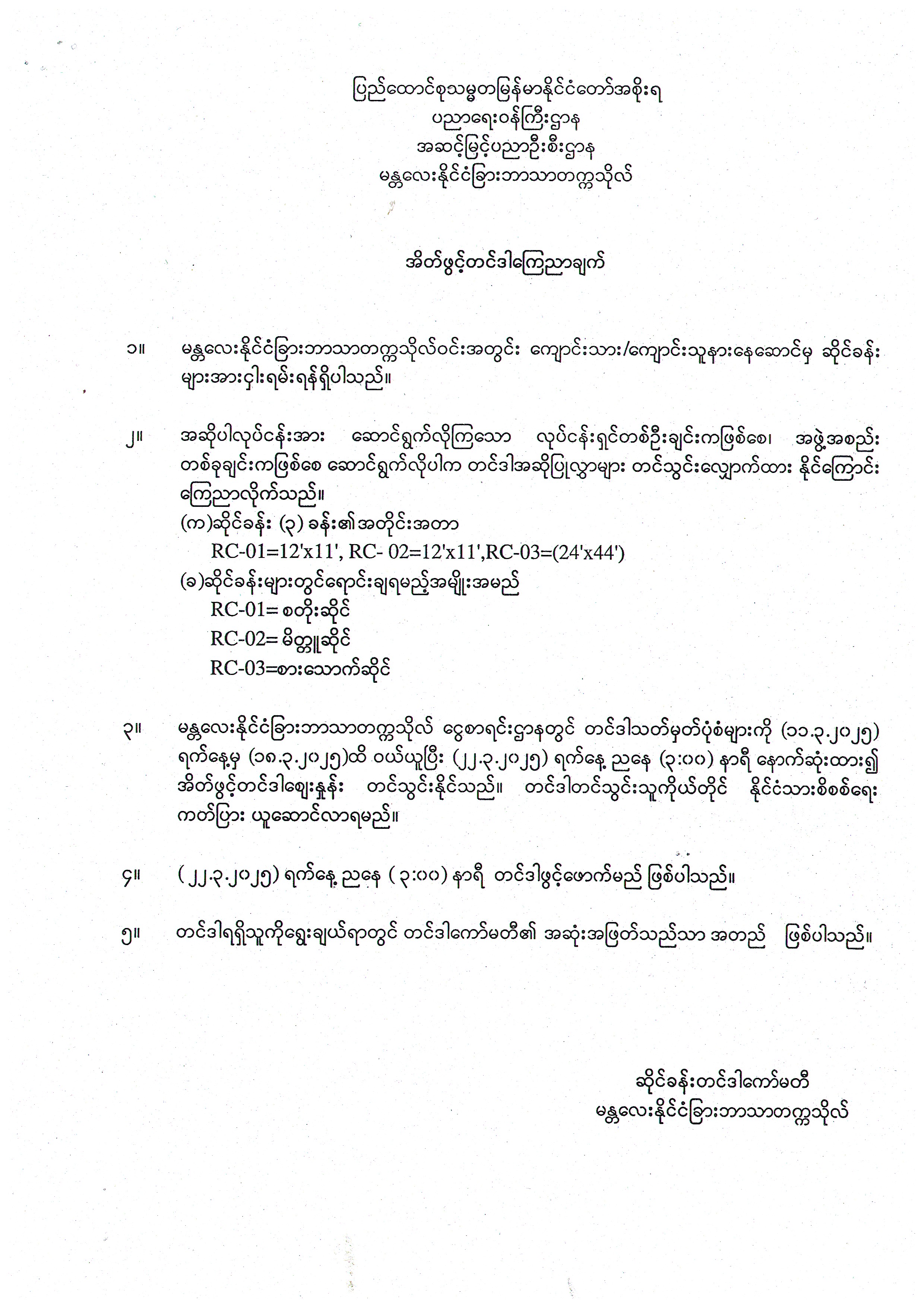 RC ဆိုင်ခန်းများငှါးရမ်းခြင်းအတွက်အိတ်ဖွင့်တင်ဒါခေါ်ယူခြင်း Published: 07 March 2025 Category: Announcements