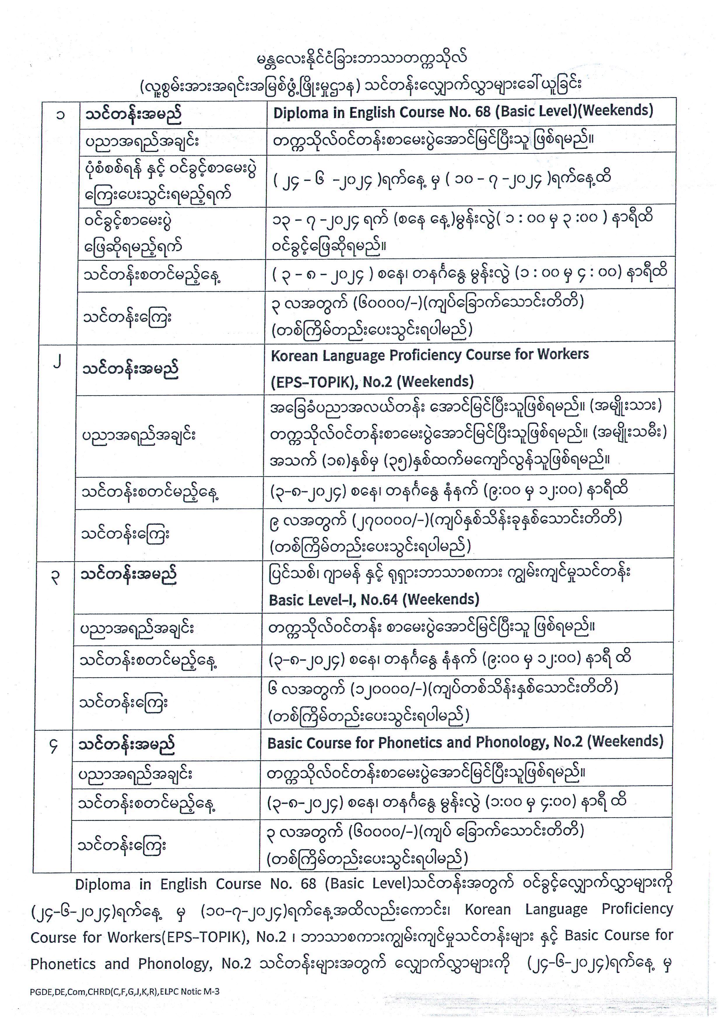 (လူ့စွမ်းအားအရင်းအမြစ်ဖွံ့ဖြိုးမှုဌာန) သင်တန်းလျှောက်လွှာများခေါ်ယူခြင်း Published: 21 June 2024 Written by MUFL admin Category: Announcements