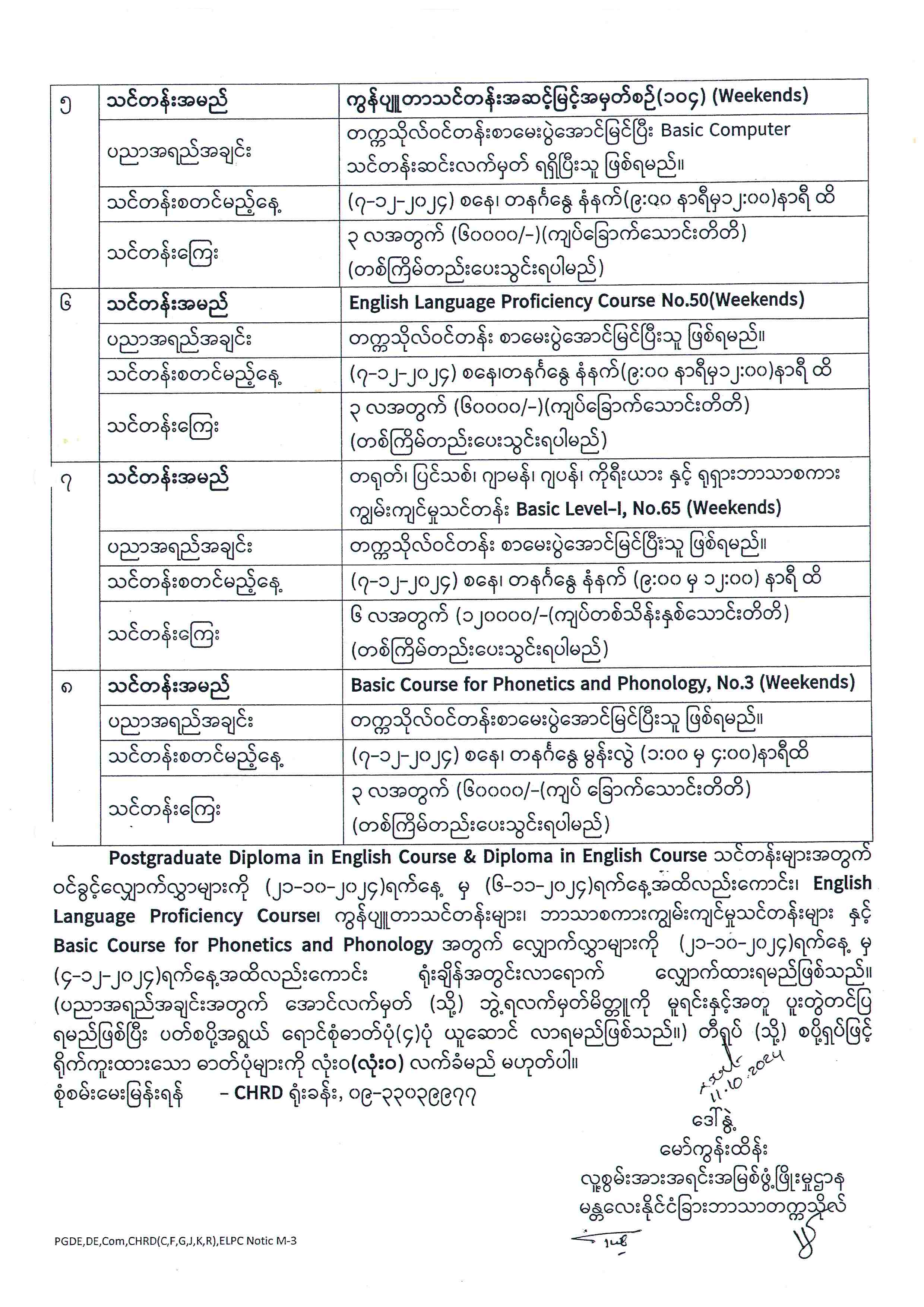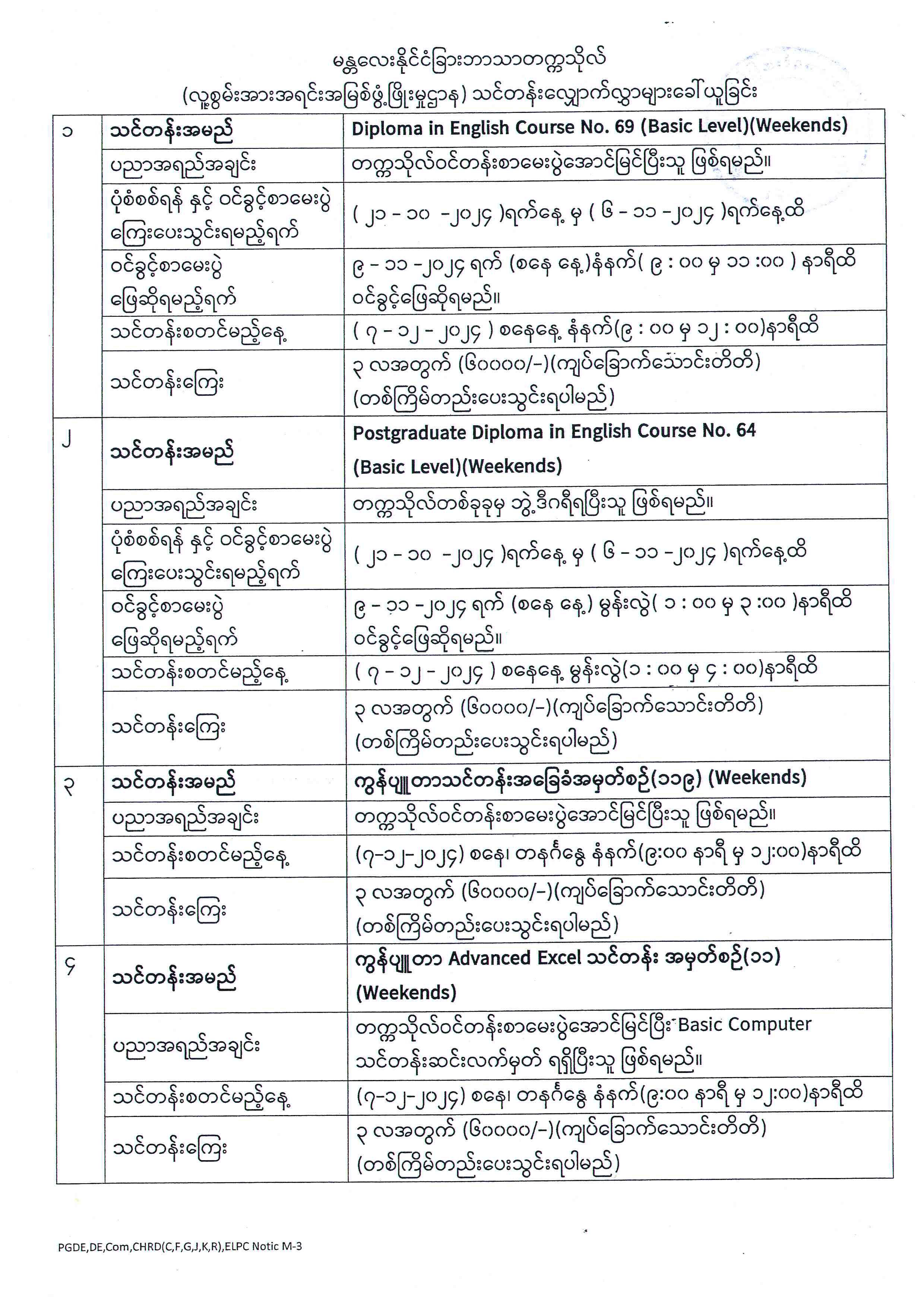 (လူ့စွမ်းအားအရင်းအမြစ်ဖွံ့ဖြိုးမှုဌာန)သင်တန်းလျှောက်လွှာများခေါ်ယူခြင်း Published: 14 October 2024 Written by MUFL admin Category: Announcements
